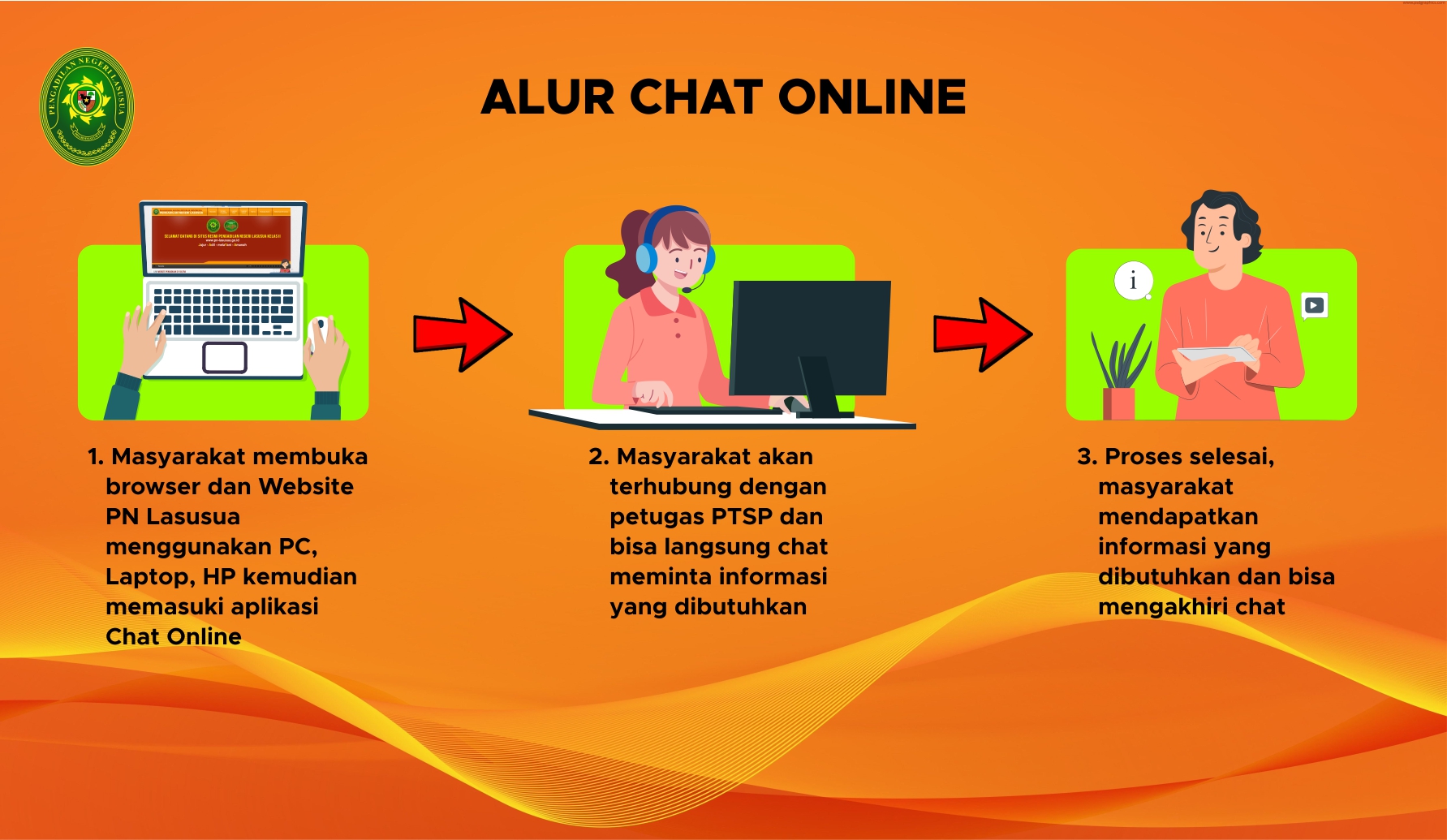 Pengadilan Negeri Lasusua juga menyediakan layanan fasilitas chat secara live dengan petugas PTSP yang dapat diakses melalui laman website di pojok kanan bawah. Fasilitias ini disediakan sebagai sarana komunikasi dengan petugas melalui chat.